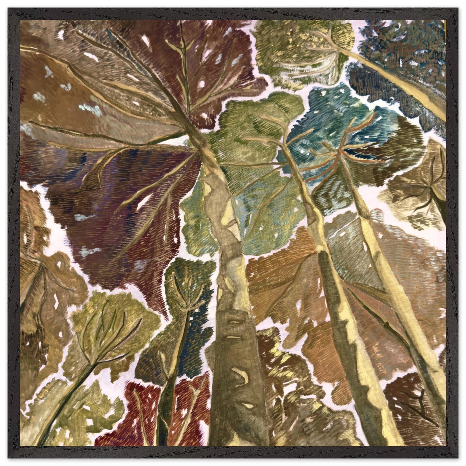 Addition to the series of Crown shyness is an interesting phenomenon that happens when neighbouring trees avoid touching each other, it is believed they naturally do this to cooperate with each other to ensure there is enough light to hit the floor of the forest. The series of Crown Shyness, plays with colour and light, as the trees look flat and morphed as they communicate with each other to co exist.
